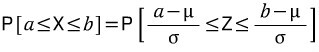 정규분포에서 표준정규분포로 표준화는 다음 관계식을 통해 표준정규분포로 대응시켜서 확률 값을 계산한다.