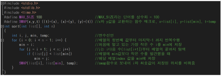 따라서 이진탐색을 구현하기 위해서는 반드시 배열에 저장된 데이터가 정렬되어 있어야 한다. 이번 자료구조에서는 선택정렬을 통하여 정렬을 수행하였다.