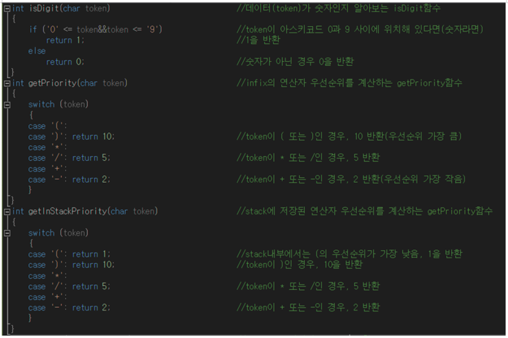 따라서 stack에 저장되어있던 연산자의 우선순위와 token의 우선순위를 비교하여, stack에 저장되어 있던 연산순위가 높거나 같다면 먼저 postfix에 저장한다. (getStackPriority는 스택의 데이터 우선순위 파악, getpriority는 token의 우선순위를 파악한다, 다음단락에서 설명)