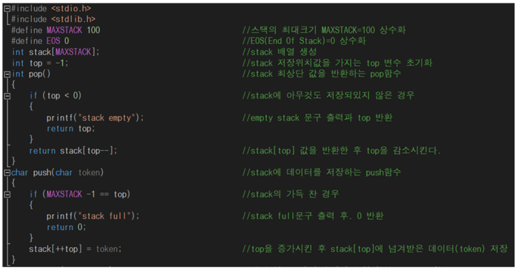 그리고 배열의 길이는 MAXSTACK으로 TOP의 위치가 MAXSTACK-1인 경우 배열의 가장 마지막을 의미하기 때문에 STACK FULL을 출력한다.