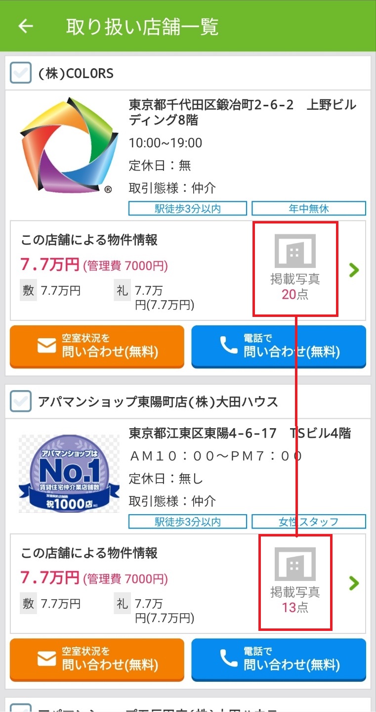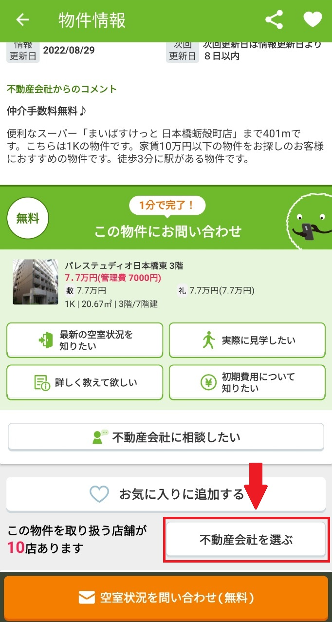 그리고 취급 부동산 점포가 한 개인 경우도 있지만 여러개인 경우에는 부동산에 따라서 다소 레킨의 금액이 다른 경우가 있다. Suumo에서 찾아볼 때 아래와 같이 부동산 회사 선택을 클릭하여 한번 살펴보기를 추천한다. 보다보면 기재 사진의 수가 다른 경우도 있으니 추가 정보를 얻을 수도 있다.