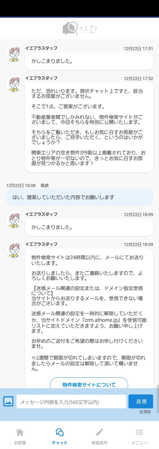 해당 어플은 イエプラ 라는 어플리케이션으로 전체적인 사용방법은 suumo, homes와 크게 다르지 않지만 대화형식으로 상담원(or AI)가 원하는 조건의 방을 찾아주는 방식이다.