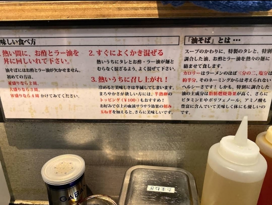 아부라소바는 분명 한국에는 없는 맛이다. 타베로그를 쓰기 위해서 최근에 다시 방문하여 무슨맛인지 곱씹어봤지만 설명하기 쉽지 않다. 밀가루면의 꾸덕함과 카라미소가 섞여 달짝매콤한 맛 추가, 그 위에 온센타마고의 노른자가 섞여 담백함 추가, 라유(고추기름) 및 식초를 두르면 완성. 비슷한 한국음식이 생각나질 않지만 맛있다. 매일 먹기엔 아쉽지만 한번 먹고나면 가끔씩 떠오르는 맛이다.