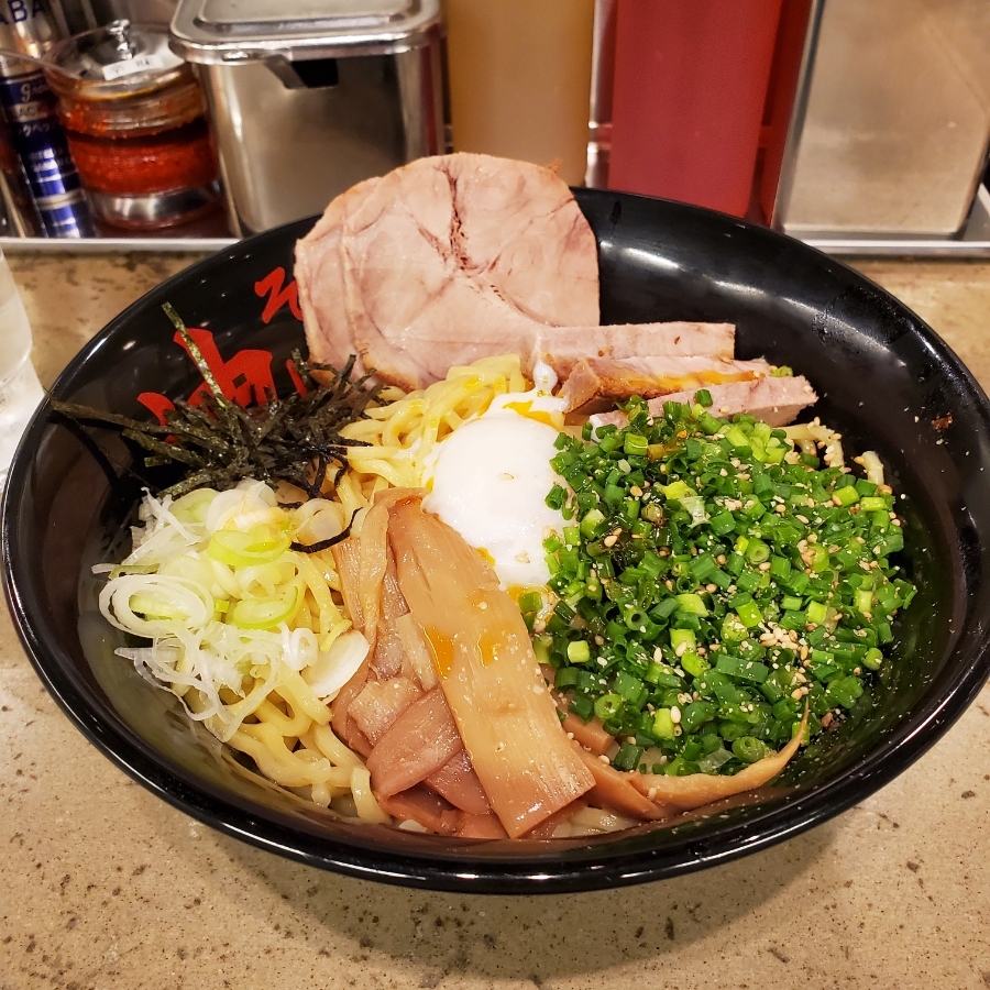 식권을 먼저 사는 시스템인데 카라미소오오모리 + 토핑B세트 추가로 1200엔에 먹을 수 있다. 한국인이라면 무조건 카라미소를 추천하고 오오모리, 더블로 해도 가격은 동일하기 때문에 면은 양껏 선택해도 된다. 면에 따라서 자리앞에 놓여있는 라유와 식초를 2, 3, 4바퀴씩 두르는 것을 추천하고 있다.
